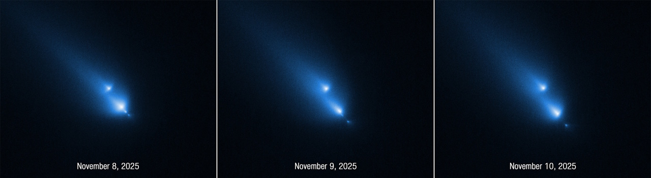 Série de imagens do cometa em processo de fragmentação, C/2025 K1 (ATLAS), ou K1 para abreviar, obtidas pelo Telescópio Espacial Hubble da NASA/ESA ao longo de três dias consecutivos (8, 9 e 10 de Novembro de 2025). Captada pelo instrumento STIS (Space Telescope Imaging Spectrograph) do Hubble, a sequência mostra a desintegração progressiva do cometa ao longo deste breve período. Esta é a primeira vez que o Hubble testemunha um cometa numa fase tão precoce do processo de fragmentação.