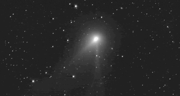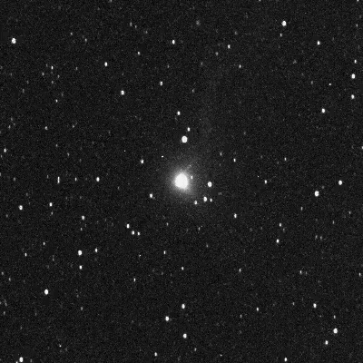 Observações do cometa 3I/ATLAS pela câmara JANUS da JUICE, no dia 5 de Novembro de 2025, quando o cometa se encontrava a 64 milhões de km da sonda. O comprimento da cauda que se estende na direcção oposta ao Sol parece ser de cerca de 6 milhões de km.