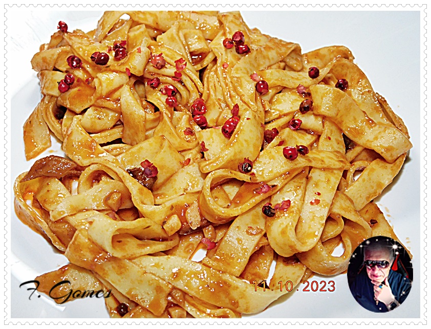 04.- Escorra a massa, adicione ao tacho e envolva bem. Sirva de seguida polvilhado com pimenta rosa em grão (opcional).