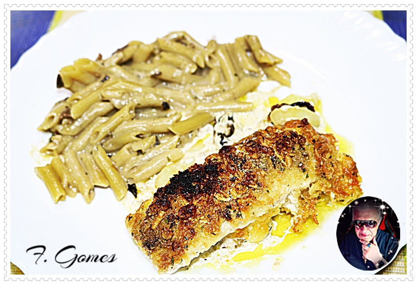 04.- Sirva de seguida com uma guarnição a gosto. Escolhi Penne com Cogumelos e terminei a refeição com um expresso e uma amarguinha algarvia. Delícia!!!