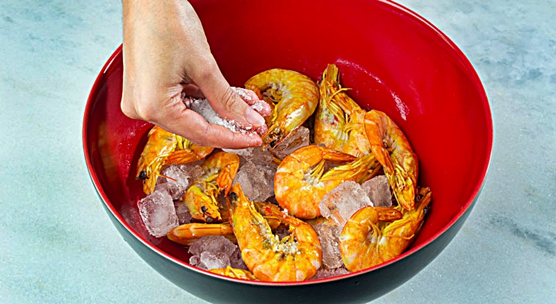 03.- Escorra o camarão e coloque-o de imediato numa taça com gelo e sal para que baixe rapidamente a temperatura. Depois de envolver bem, aguarde uns minutos para que o camarão absorva o sal.