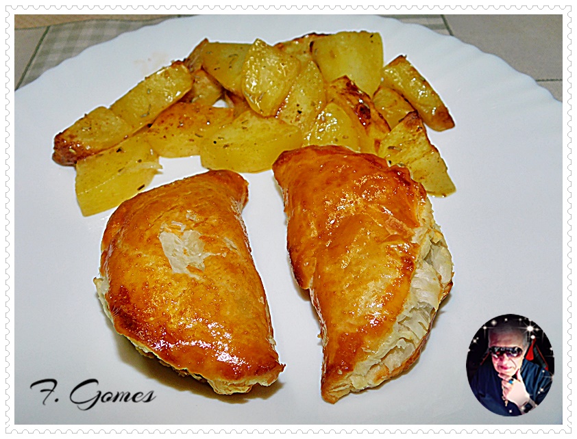 04.- Introduzi os pastéis na cesta e programei 180ºC-15 minutos. Terminado o tempo, virei os pastéis e dei mais 10 minutos com a mesma temperatura. Acompanhei com uma guarnição de cubos de batata temperados com sal, alho moído, paprika e alecrim, borrifando tudo com azeite com alecrim.