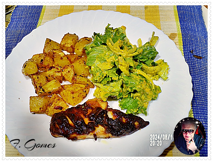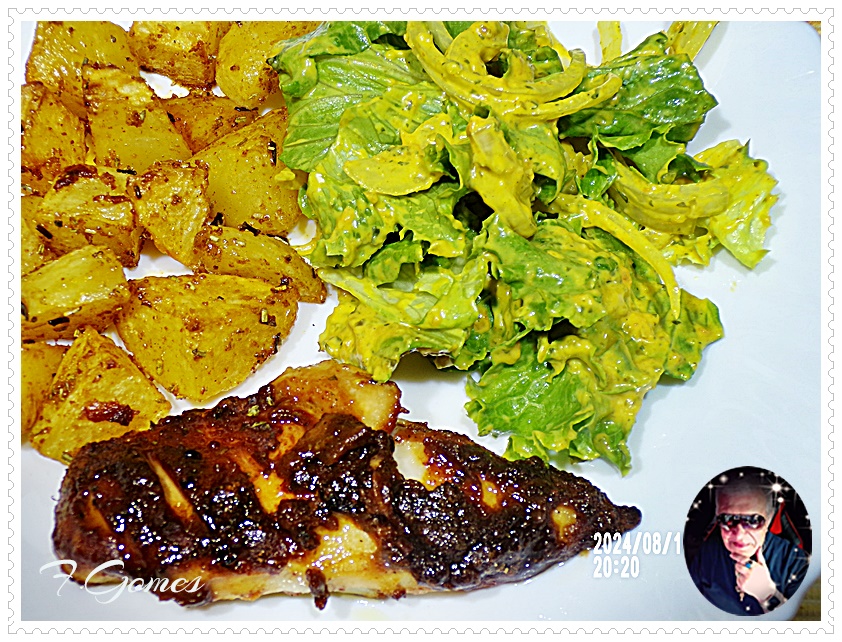 04.- Coloque os lombinhos numa travessa e sirva de seguida com batatas coradas em cubos, temperadas com um mix de ervas aromáticas a gosto, paprika. azeite virgem extra e preparadas também na Airfryer (utilizei a Airfryer de 4,4 litros) e uma salada de alface com meias luas de cebola, temperada com Molho Remoulade.