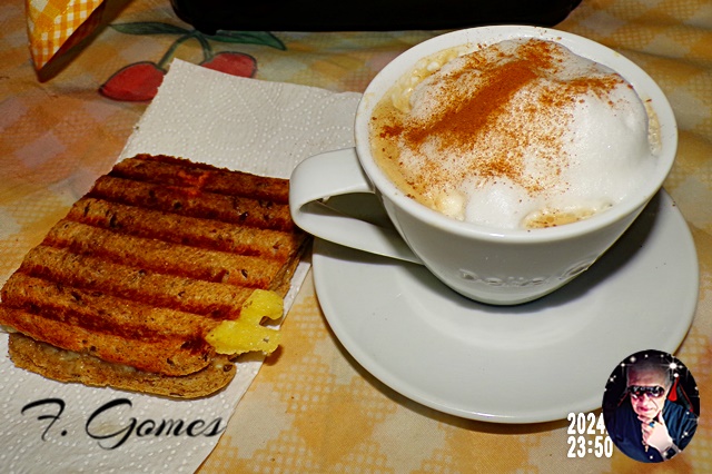 Uma tosta de queijo flamengo em pão de forma 9 cereais sem côdea, feita na sandwicheira e o Capuccino (espuma de leite, cápsula expresso e canela em pó). Uma maravilha!
