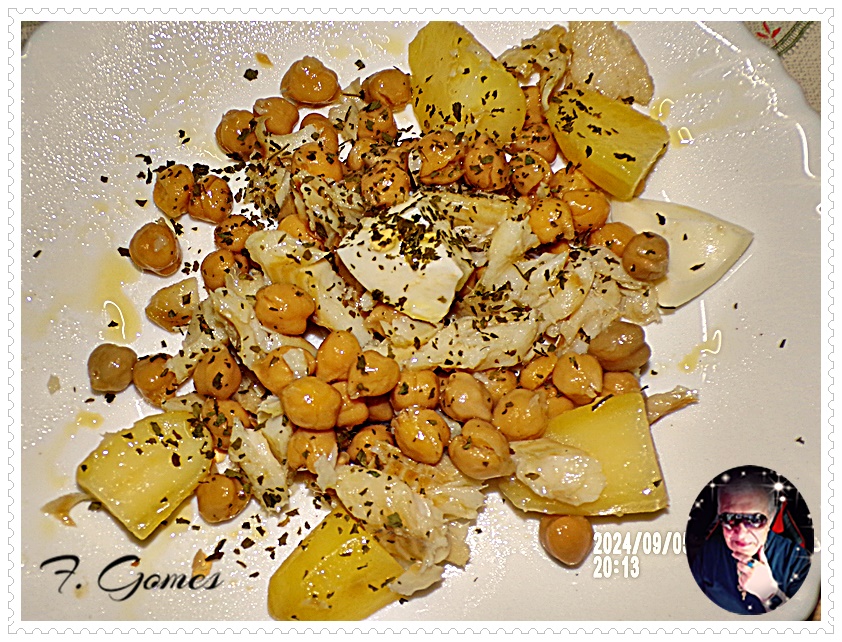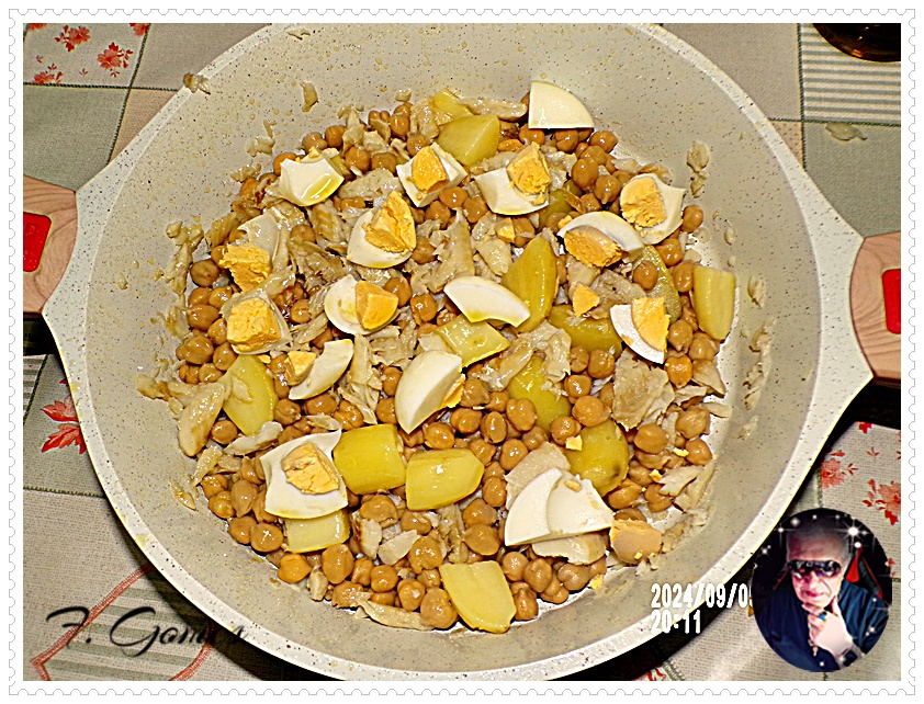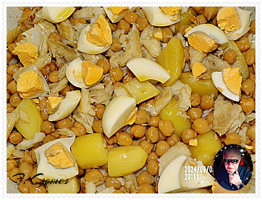 04.- Descasque e corte os ovos em quadrados. Num recipiente (estreia da frigideira/tacho de cerâmica), coloque o paloco desfiado, as batatas, o grão de bico previamente aquecido na água de cozer o paloco, a cebola picada, misture tudo, junte os ovos, polvilhe com a salsa picada e tempere pulverizando a gosto com azeite virgem extra.