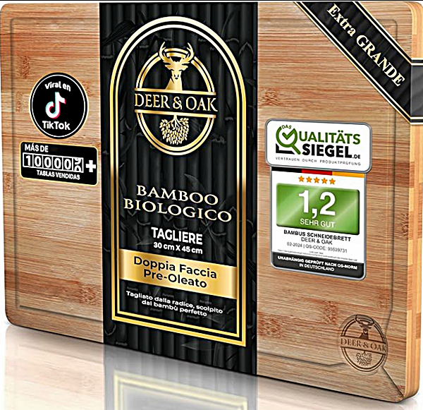– Deer & Oak Tábua de cortar – 45 x 30 x 2 cm, madeira de bambu pré-lubrificada – tábua sustentável e atraente para cortar pão, carne ou legumes.
